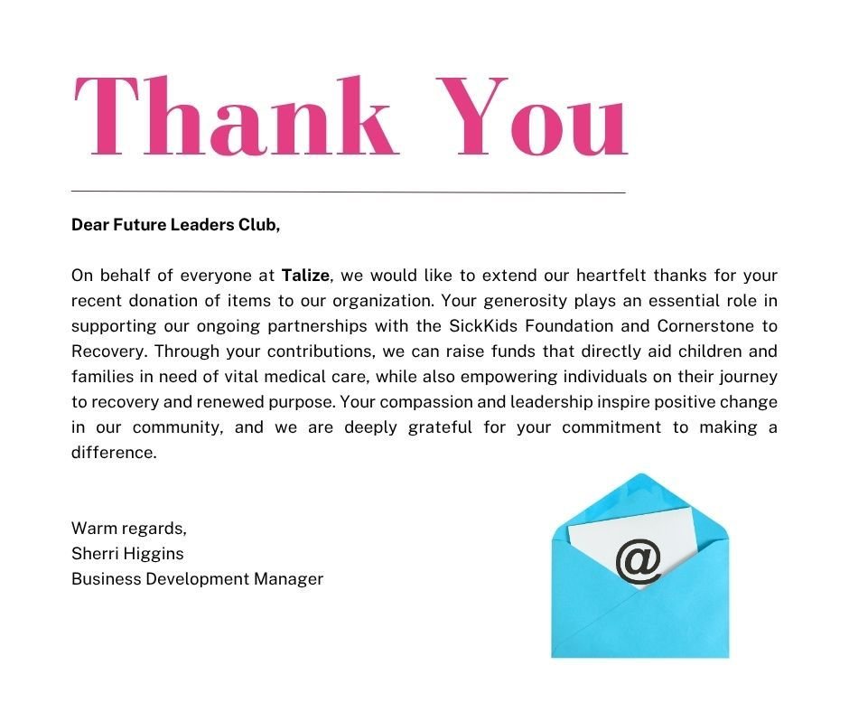 The Future Leaders Club is proud to share the positive impact of our recent donation drive! We have received a heartfelt thank-you letter from Talize for our club’s recent donation of items.